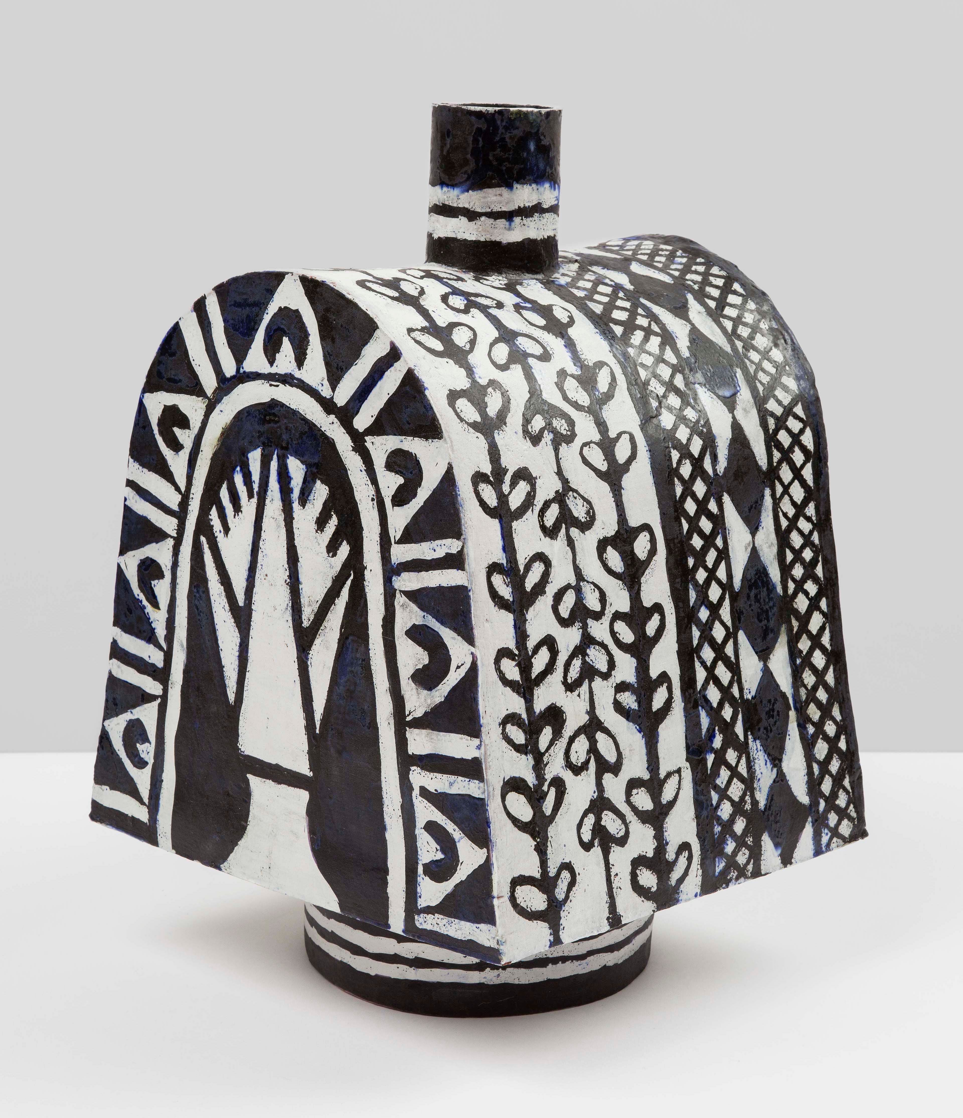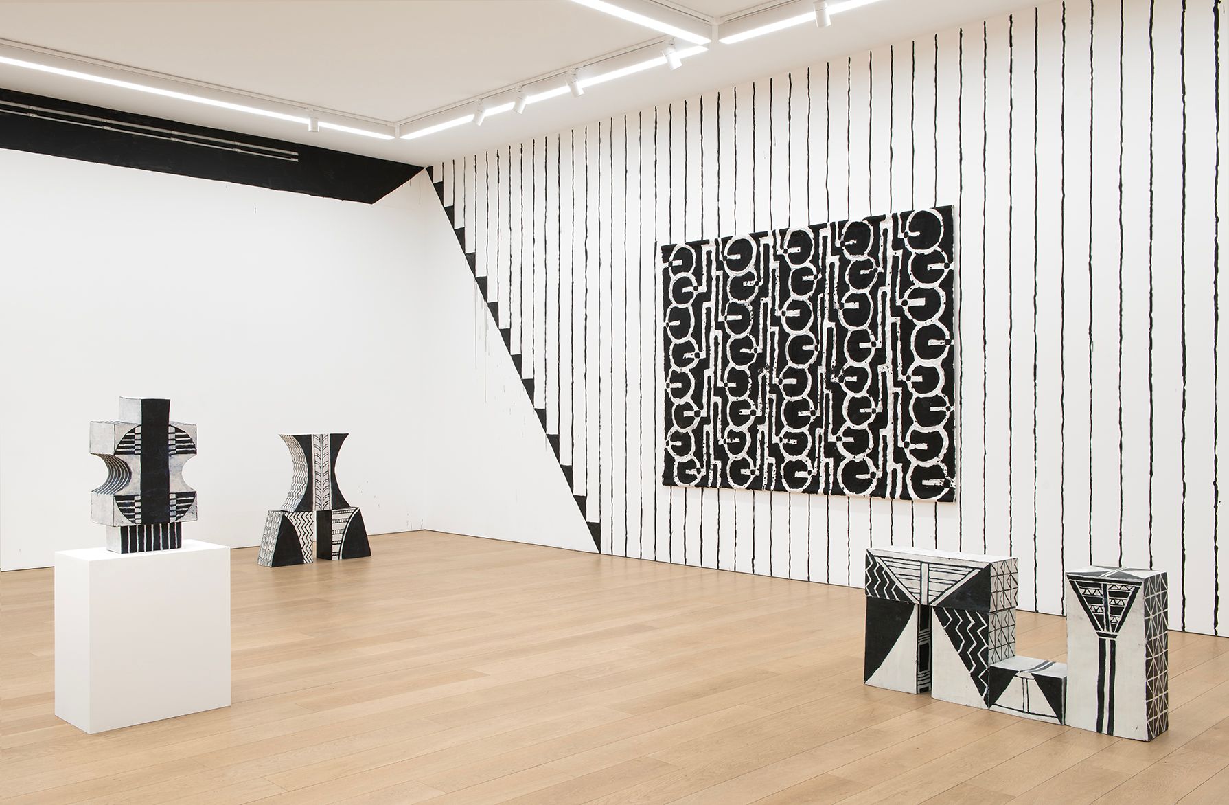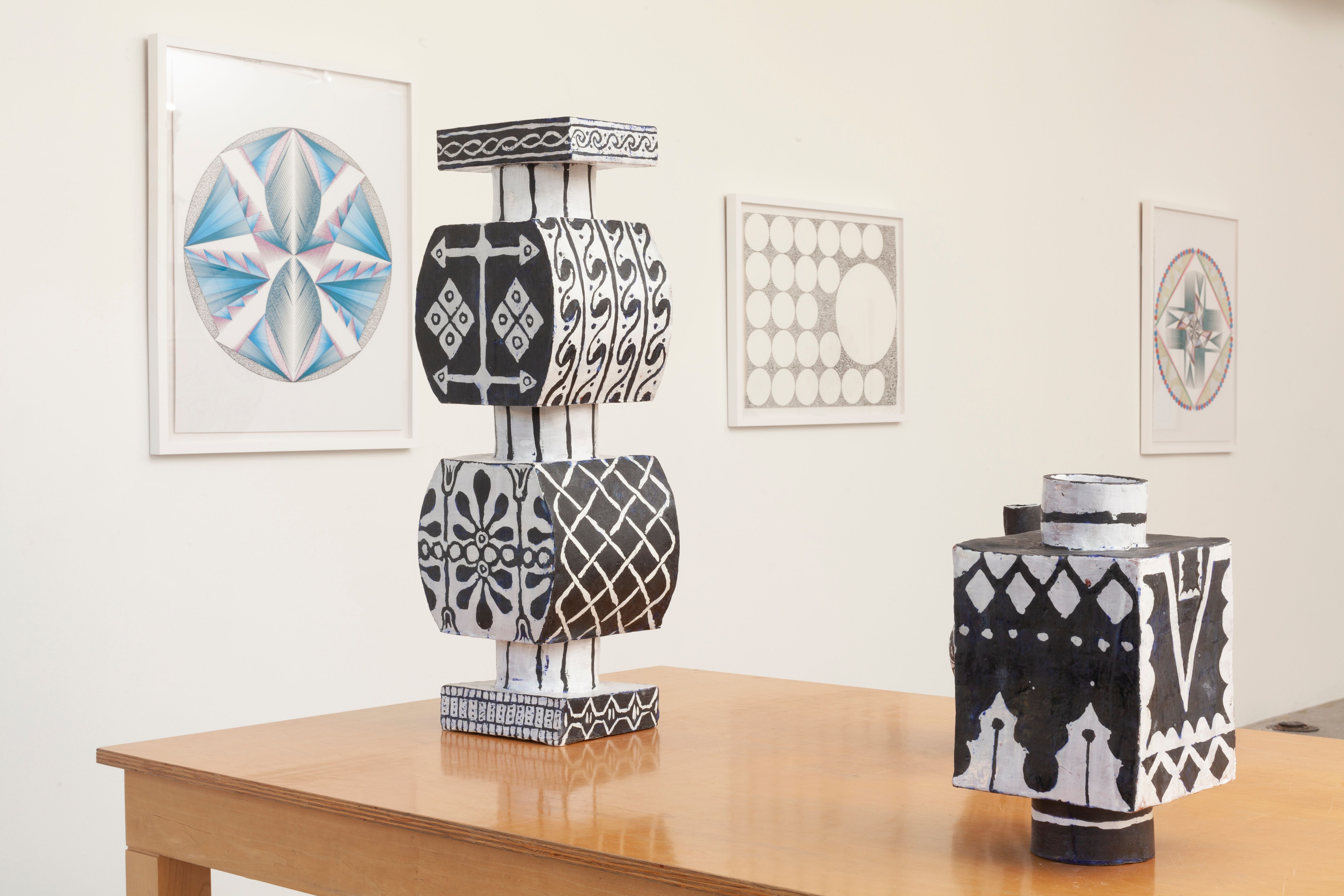 Elisabeth Kley (b. 1956, New York, NY) is known for her black and white ceramic sculptures, vessels, drawings, and site-specific paintings inspired by modernist theater sets and costume designs.