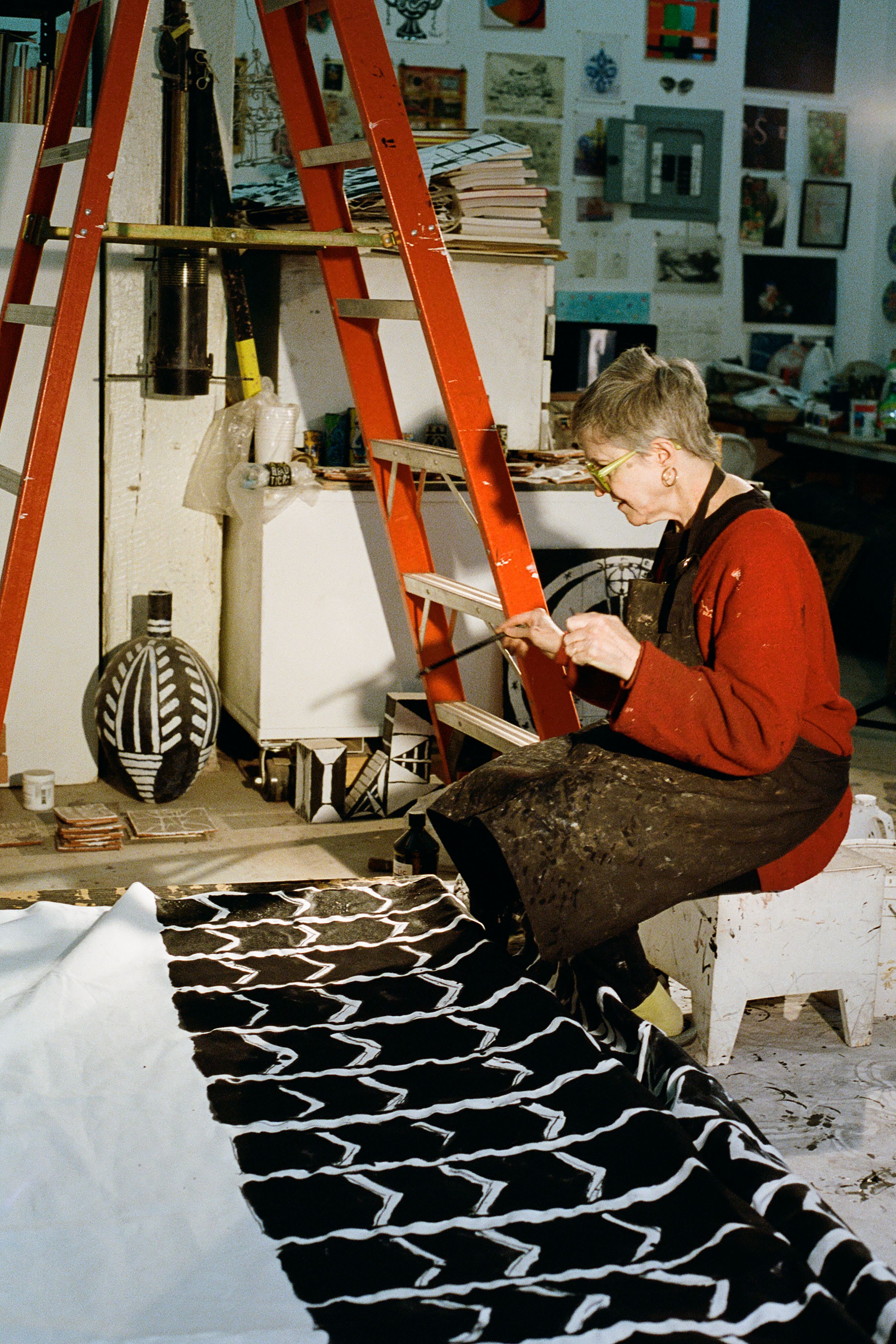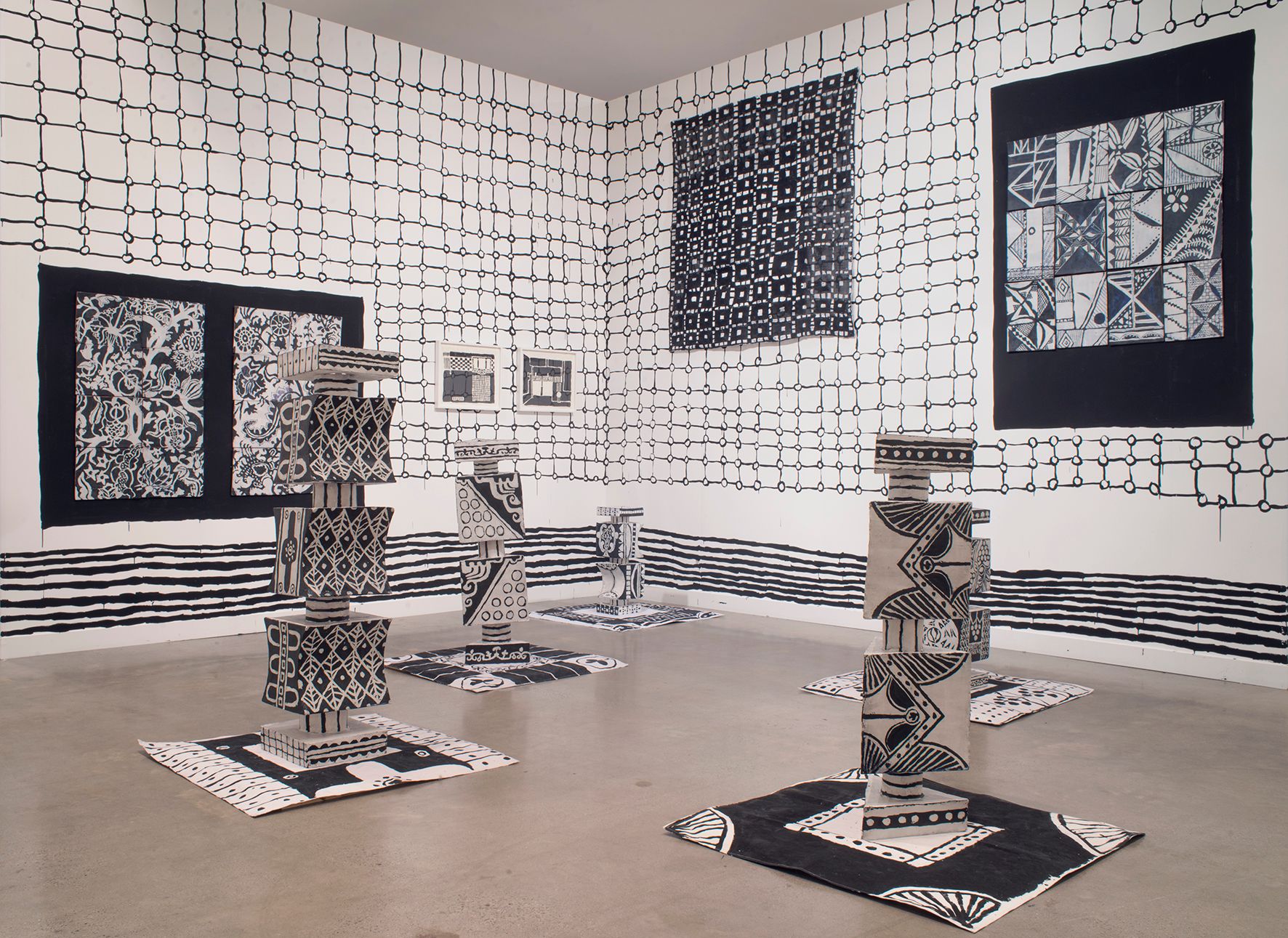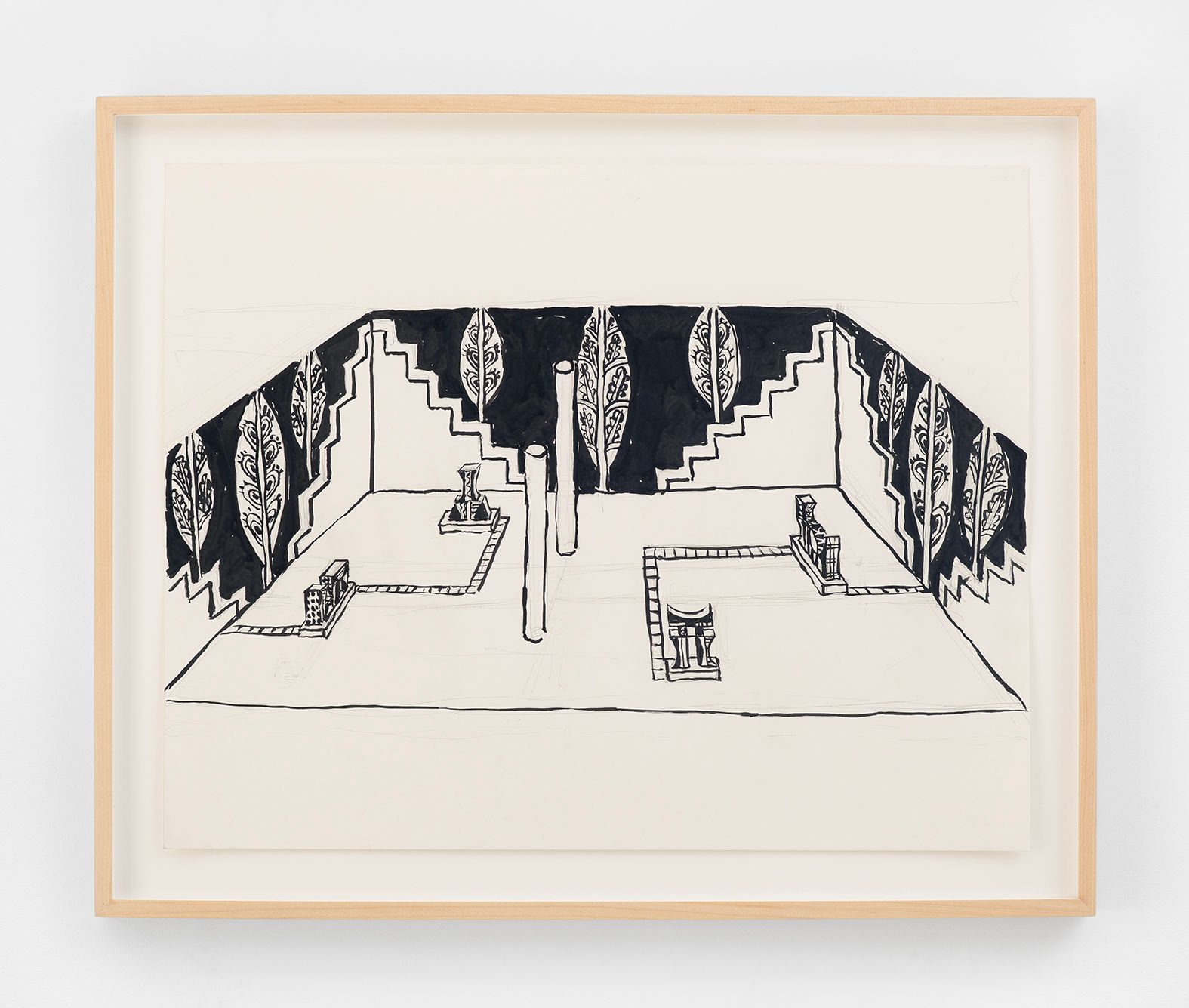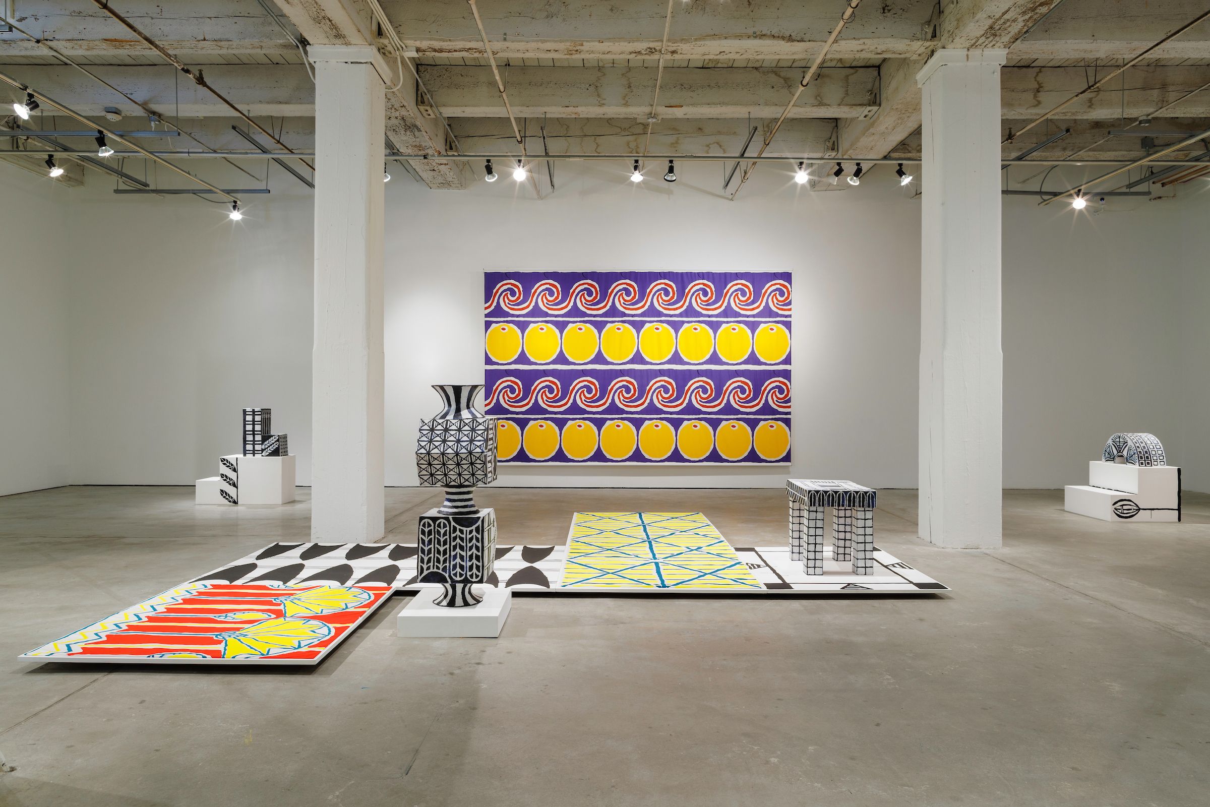 Elisabeth Kley (b. 1956, New York, NY) is known for her black and white ceramic sculptures, vessels, drawings, and site-specific paintings inspired by modernist theater sets and costume designs.