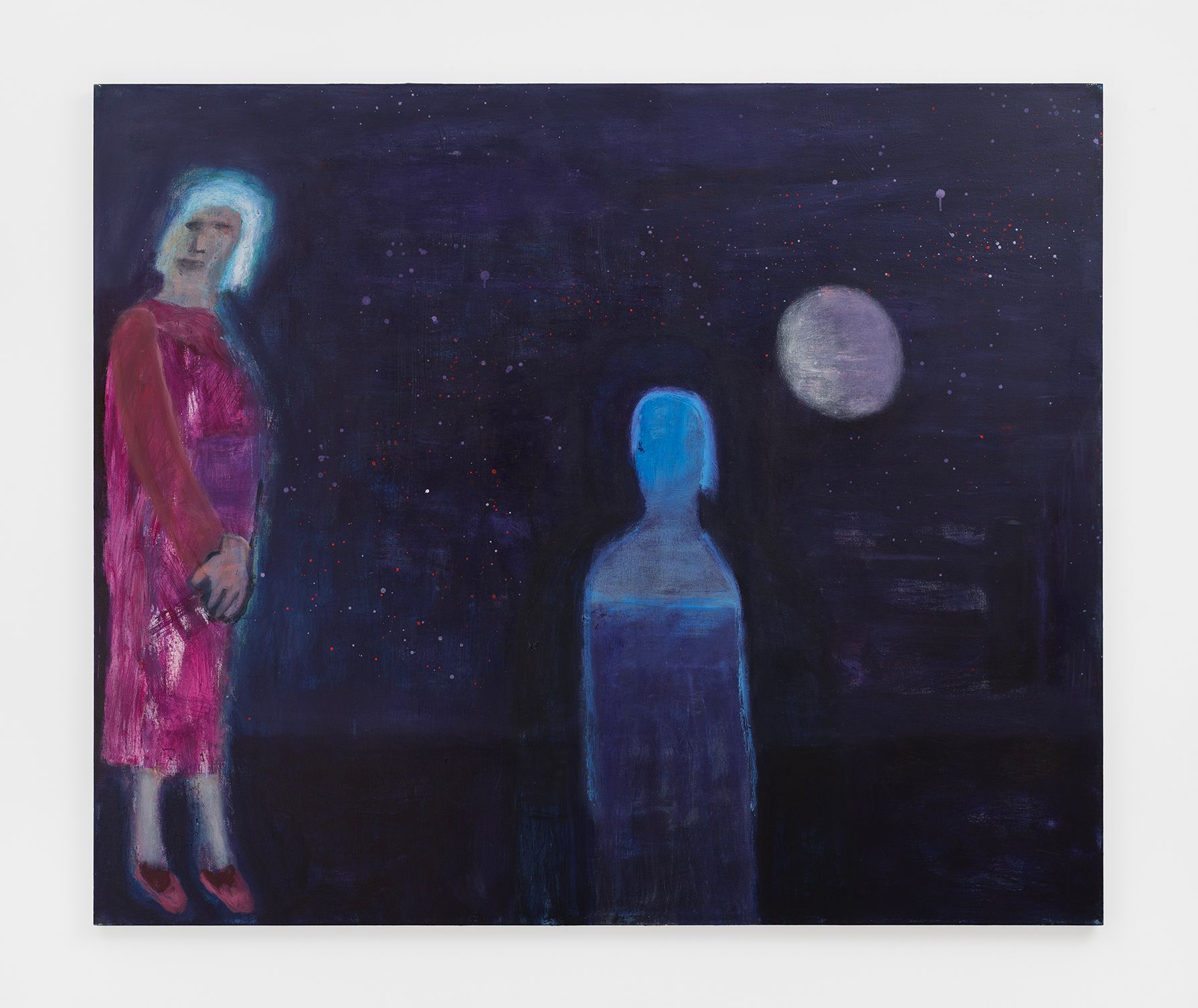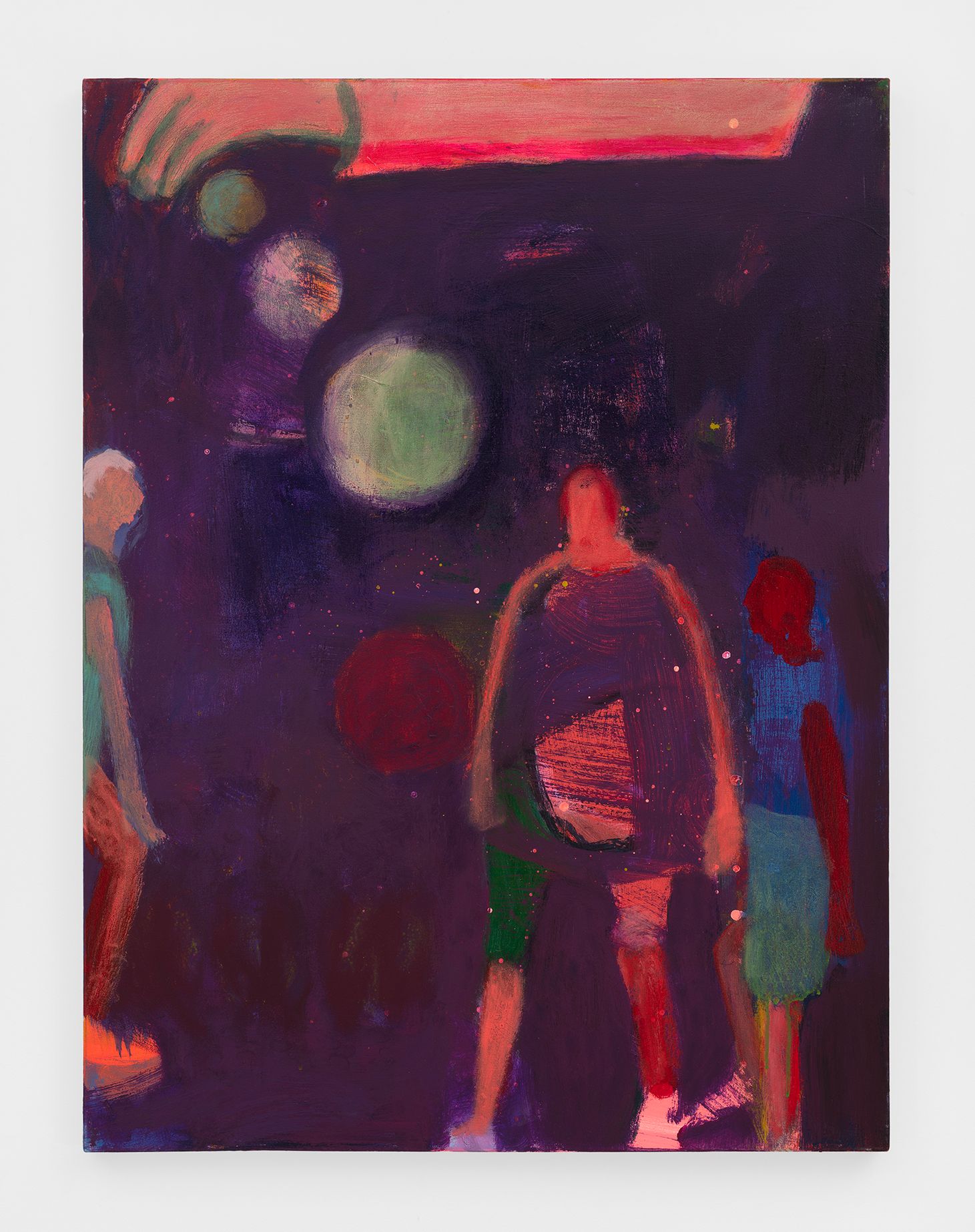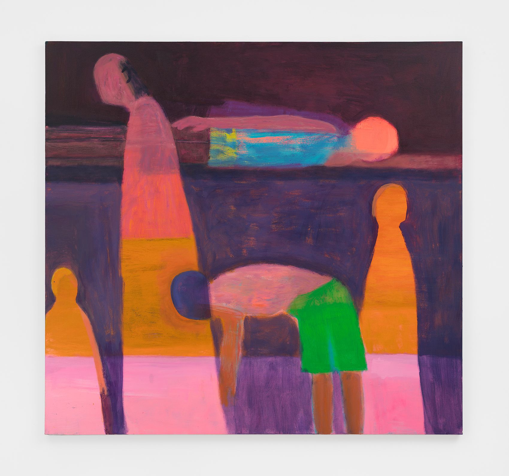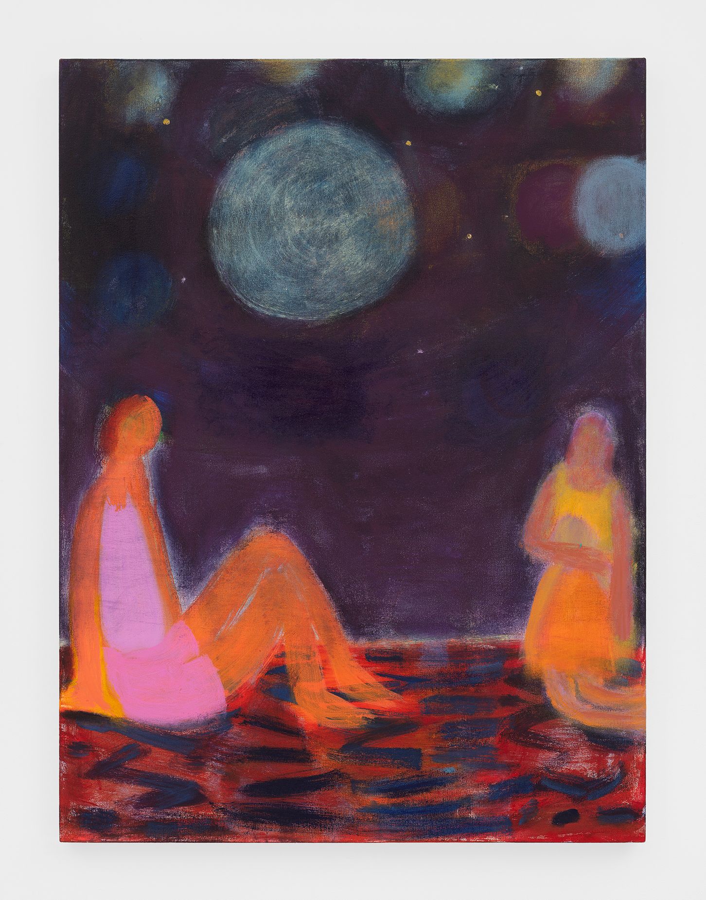 Communal Table expands Bradford’s pictorial vocabulary by combining figuration with the structure and freedom of abstract painting. To see Bradford pushing against boundaries in her sixth decade of art making is thrilling. Figures hover in states of becoming and falling apart. They drift, converse, embrace or simply exist in tension or harmony with their surroundings. In the show’s titular work, big blocks of color fit together like soft jigsaw puzzle pieces, tipped up onto the surface of the painting, presenting the top and bottom without hierarchy. Shrouds of atmospheric color envelop figures with moody purples and blues. Bradford’s technique gives some of her figures a haloing effect, as if they are radiating energy. She has gone moon crazy: some paintings have eight or more, several sport multicolored stripes. Communal Table is both an apt title and a fitting metaphor for these paintings, as people join together at tables to socialize, eat, work, daydream and study.