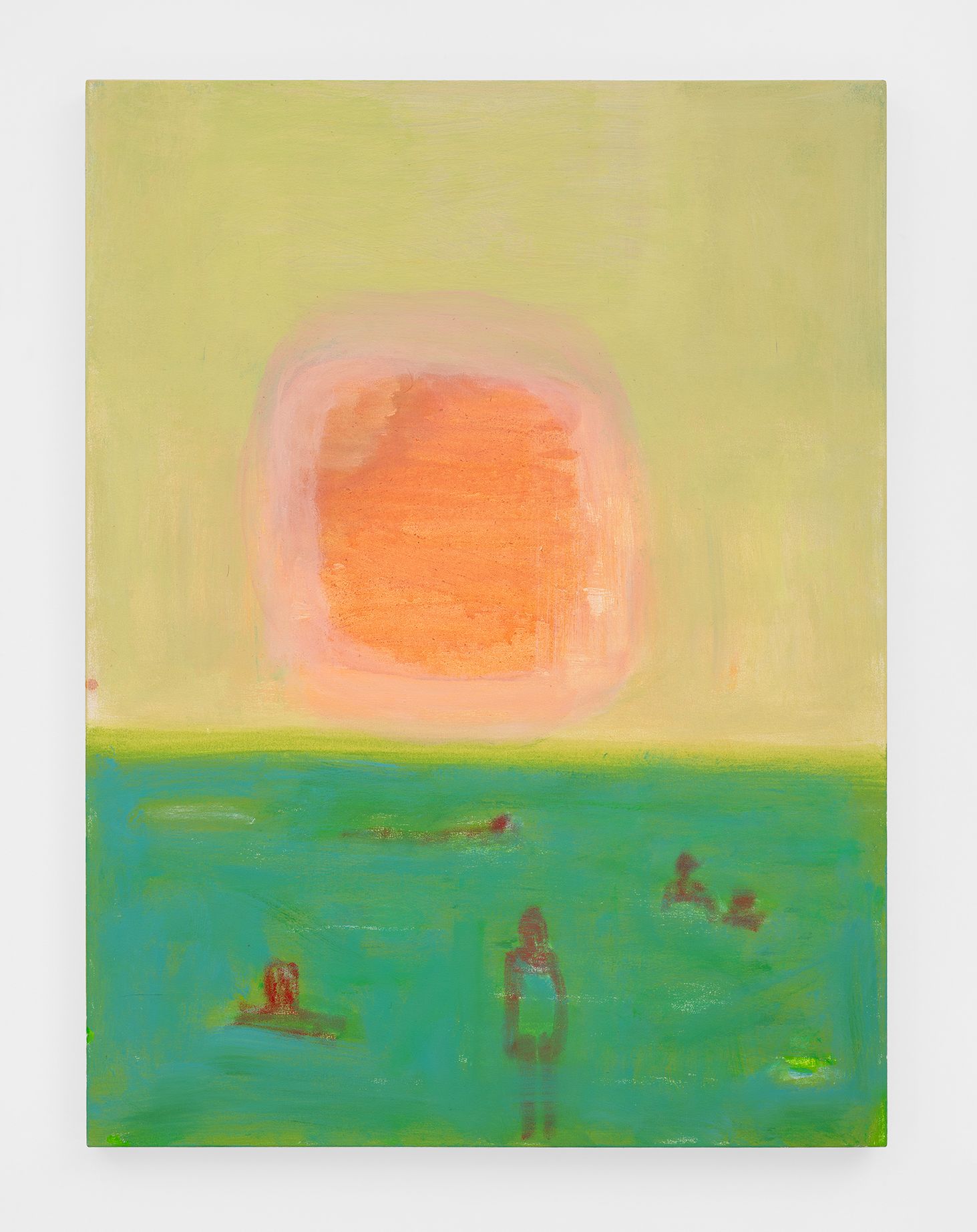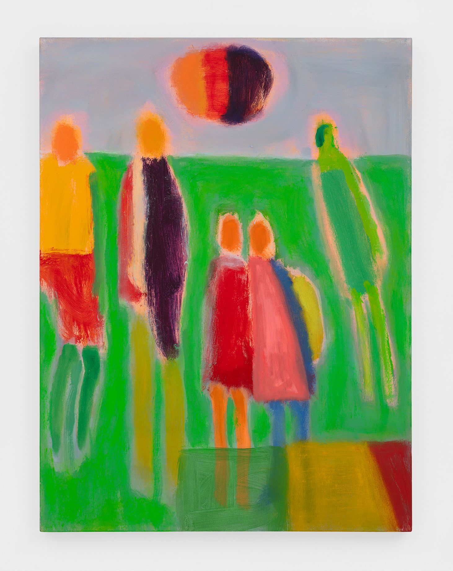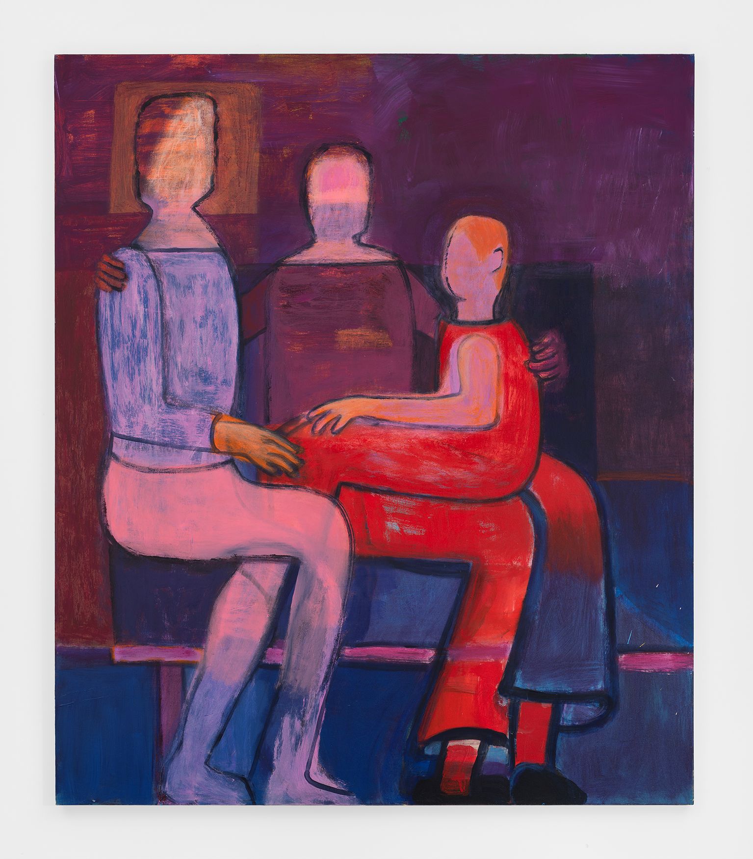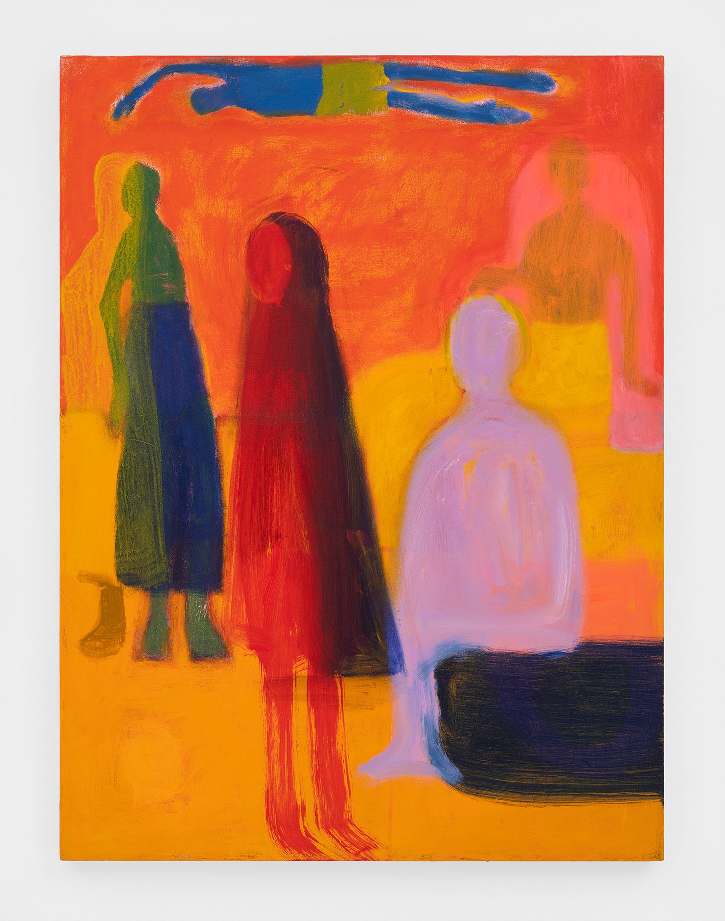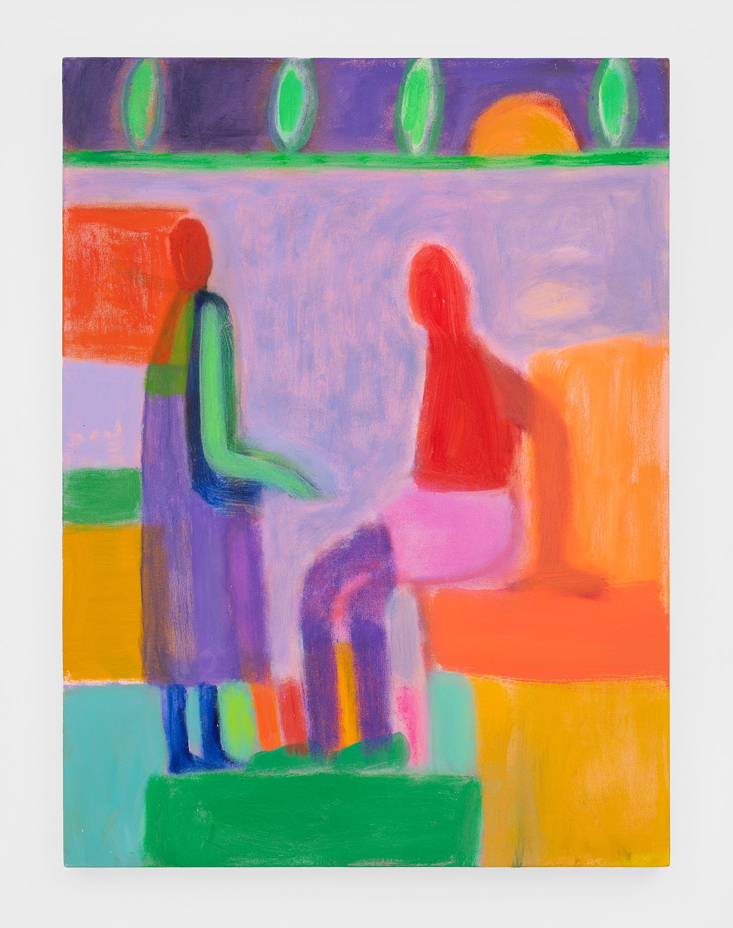 In the project room Bradford presents a series of portrait sized works suffused with bright colors that contrast with the moodier tones in some of the larger works. Bradford notes that her palette choice stems from a desire to “bring some light and warmth to New York as winter closes in.” The stripped-down figures are scruffily painted. High yellows, bright greens and reds simultaneously make up her subjects’ smocks, scarves and tunics while embodying their material reality.