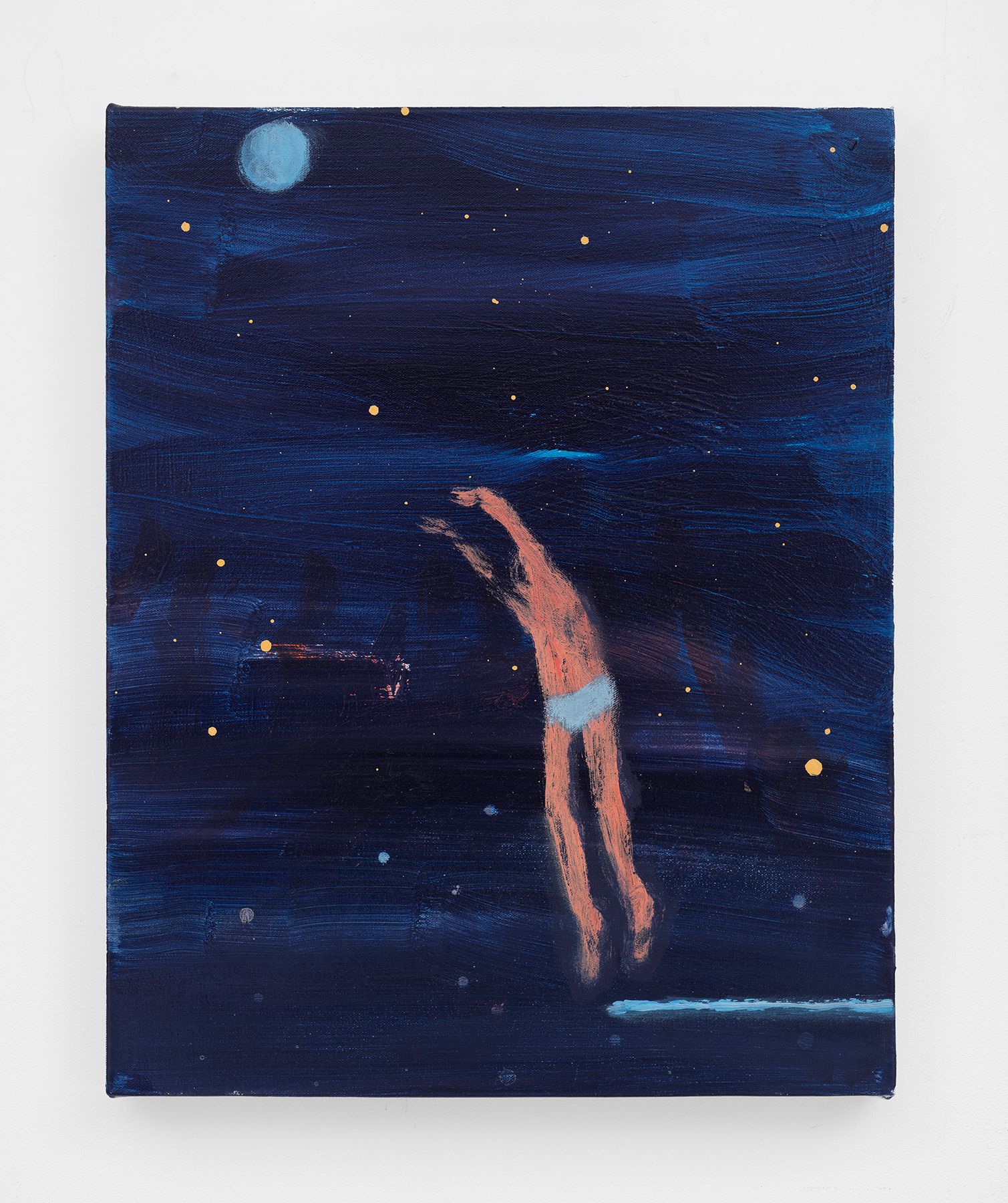 Bradford teases a sense of allegory with her imagery. In Gifting Bowl, three multicolored hands attached to disembodied arms dip into a transparent bowl, economically rendered with a single yellow line. The bowl is curiously empty and the act of taking is done in a gently automatic way, as if the giving and receiving happen in a fugue state. A woman holds a book to her chest and observes. The ambiguity that Bradford achieves never feels rhetorical or tricky, rather rooted in a state of bemusement.