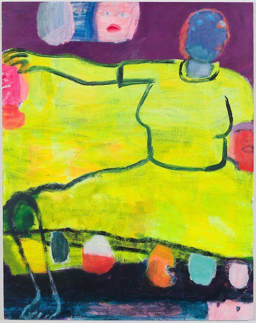 Her color palette has shifted: confident blocks of moody pinks, deep blues and hot fluorescent yellows are broken up into scruffy fields with arches, chunky lines, opaque shapes and bisecting marks. The paintings feel lit from within - not quite interior or exterior - and give the sense that each is its own hermetic universe, operating with distinct moralities and peculiar gravity. Figures float, lean, embrace, overlap, and are subject to erasure. The layers and modifications Bradford leaves for the viewer seem to allude to her first impulses when approaching blank canvases with vague notions of what each painting will be about.