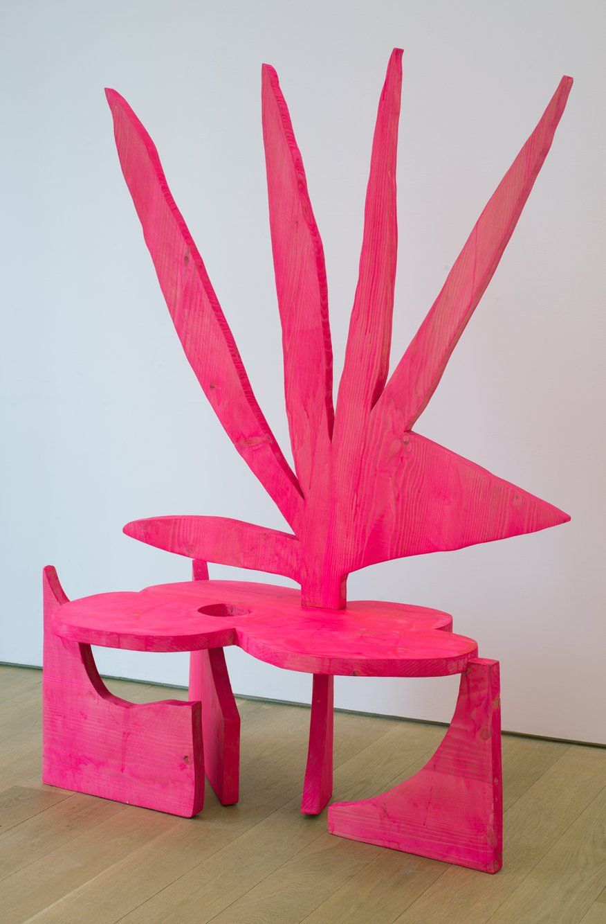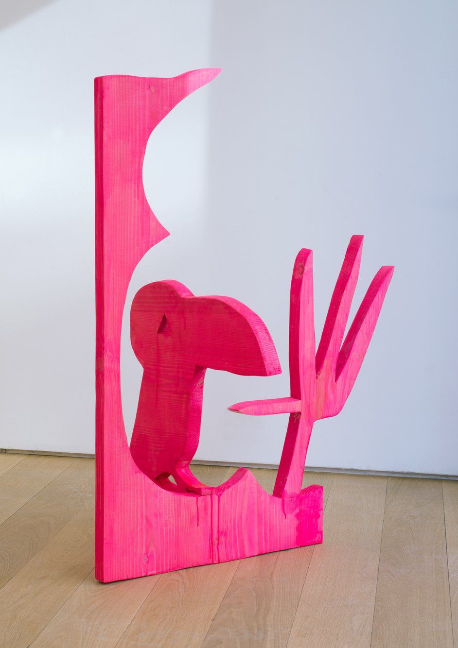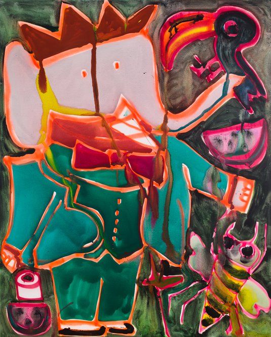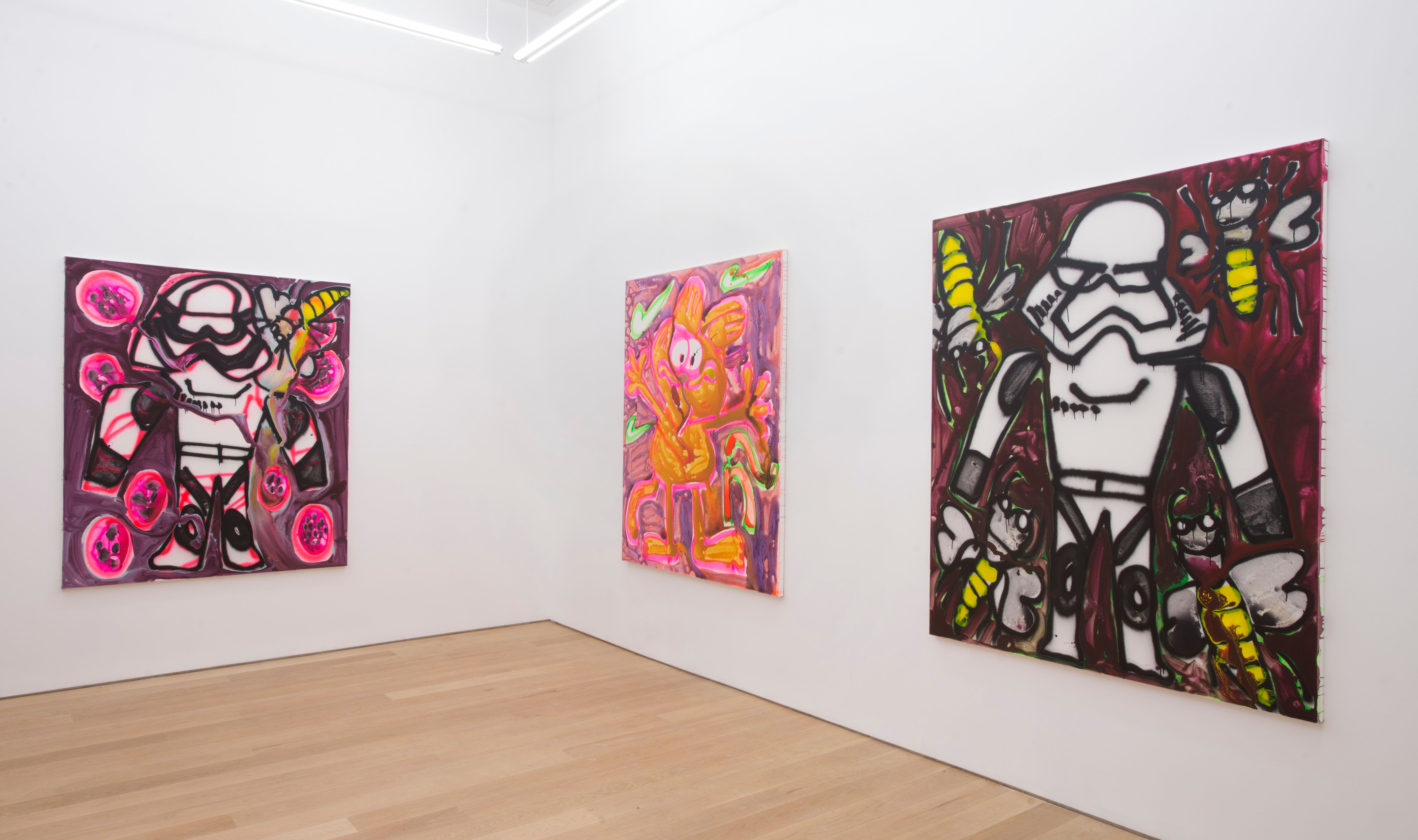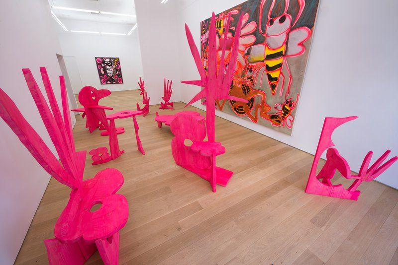 Green is Katherine Bernhardt’s fifth solo show with the gallery and finds the artist oscillating between optimism and dread. Bernhardt uses green to allude to jungles, money, grass, smoggy air pollution, barf, and envy. Green also refers to Soylent Green the classic dystopian movie, which tells the story of environmental collapse and moral decline. The paintings depict robotic killer bees, huge avocados, Garfield, bottles of Coke, Nike swooshes and manufactured crap that is contrasted with the delights of nature. Bernhardt has also made a series of painted wood sculptures which augment and extend her painted forms; they are hybrids of flora, fauna and furniture painted tropical day-glo pink.