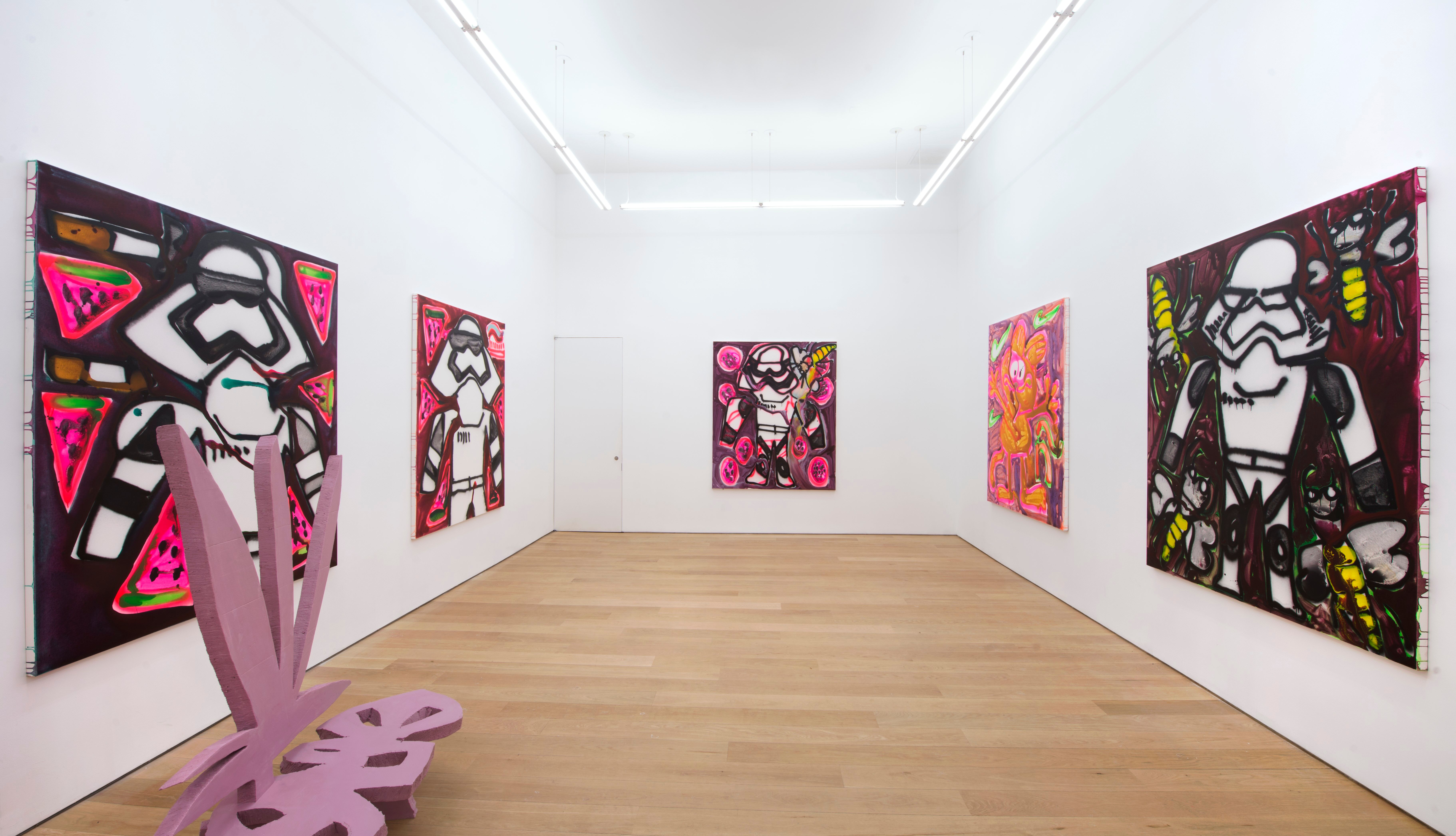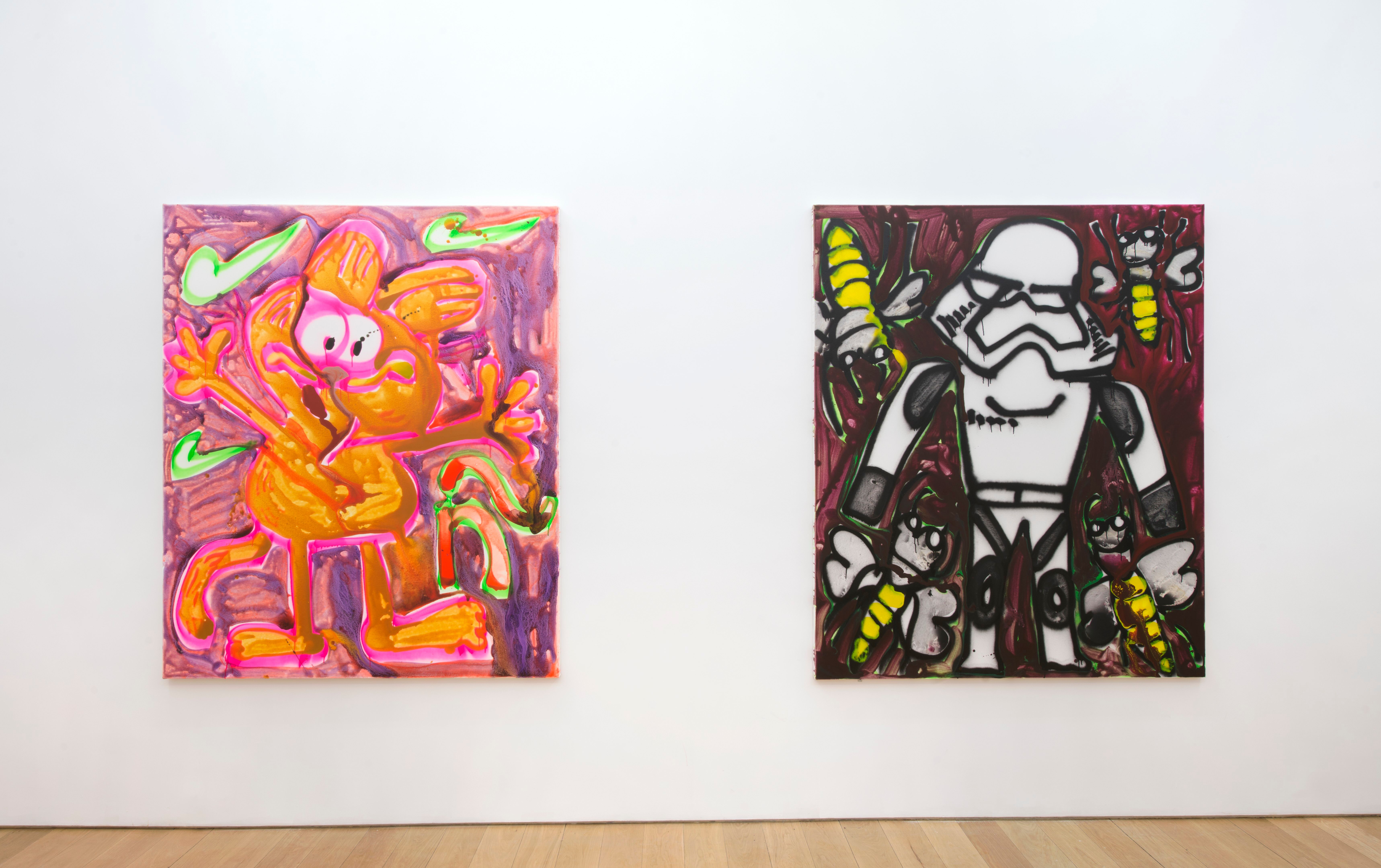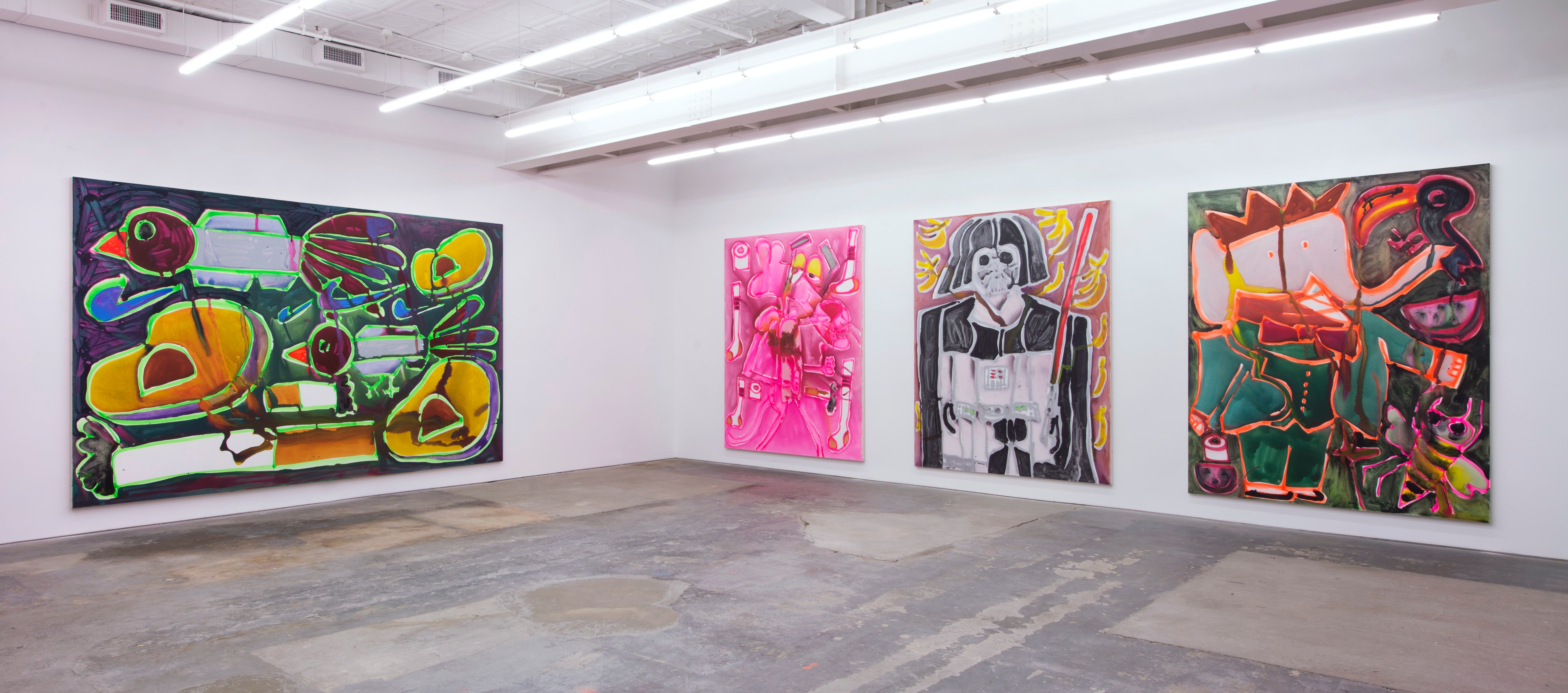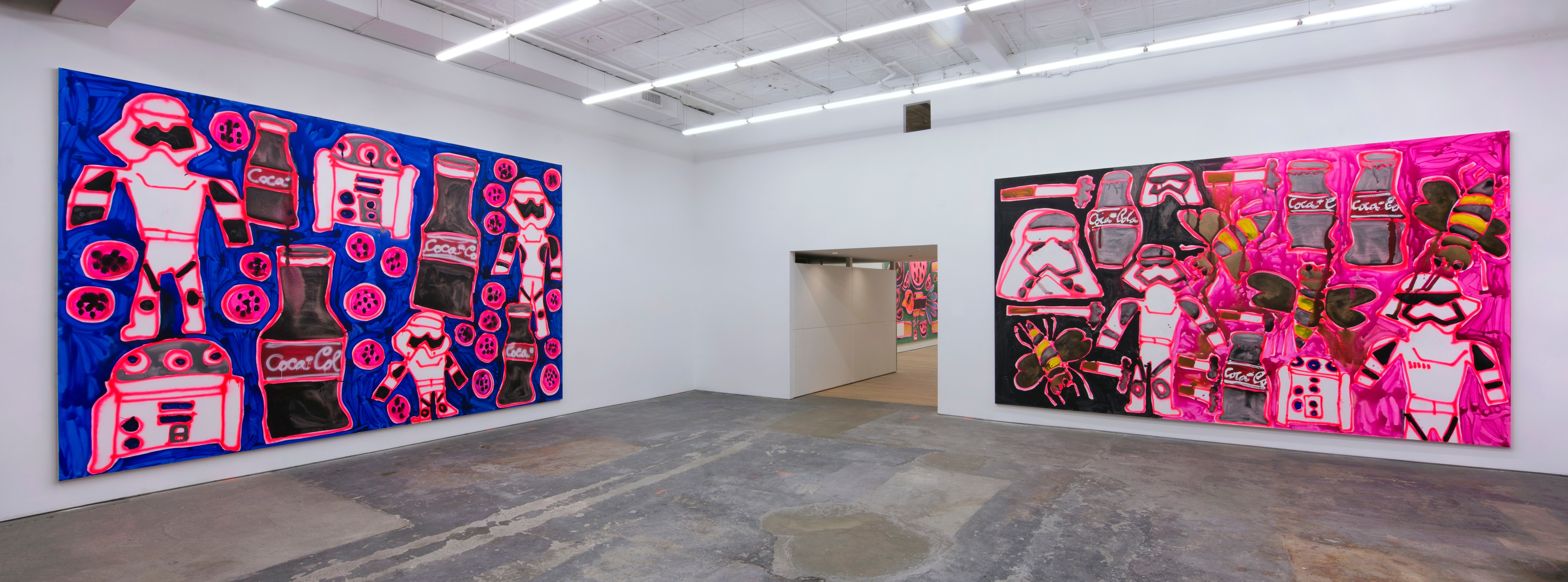 Bernhardt finds a new sense of up and down with a return to figuration. The paintings are so large that Bernhardt painted them face-up on her studio floor. The process is direct and straightforward. She outlines things and characters with spray paint and then “colors” them in with thinned-out acrylic. The resulting color flows and puddles to add a sense of uncertainty and loss of boundary. There are many chance moments that conjure a weightless feel: opaque paint pools in odd places causing a drippy light saber or mussed-up bowtie on Babar.