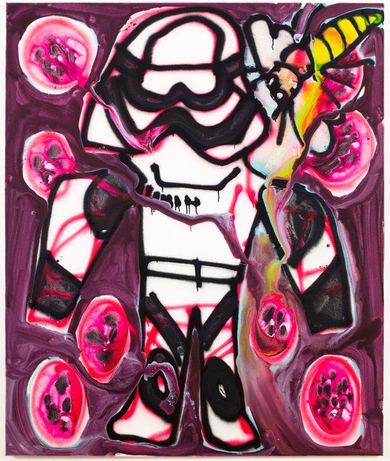 The introduction of figures (Darth Vader, stormtroopers, the Pink Panther) gives the works allegorical power as Bernhardt’s painting seems to offer a warning about our materialistic culture and its mindless waste. The paintings reflect a political climate where suddenly good and evil seem to be colliding again, even though who is good and who is evil is anyone’s guess. Bernhardt doesn’t provide any simple answers, but allows her attraction, revulsion and sense of wonder to flow.