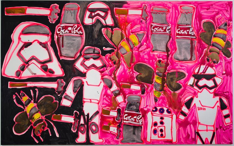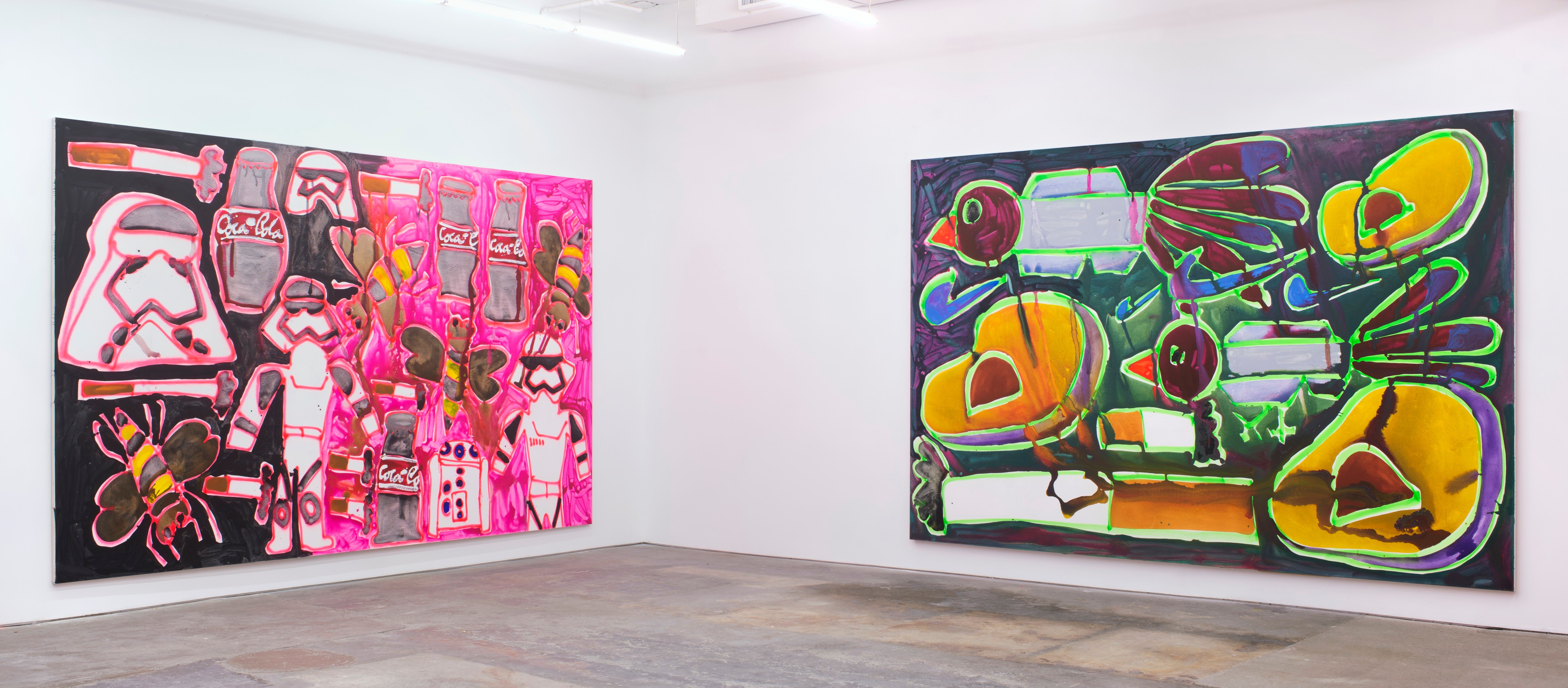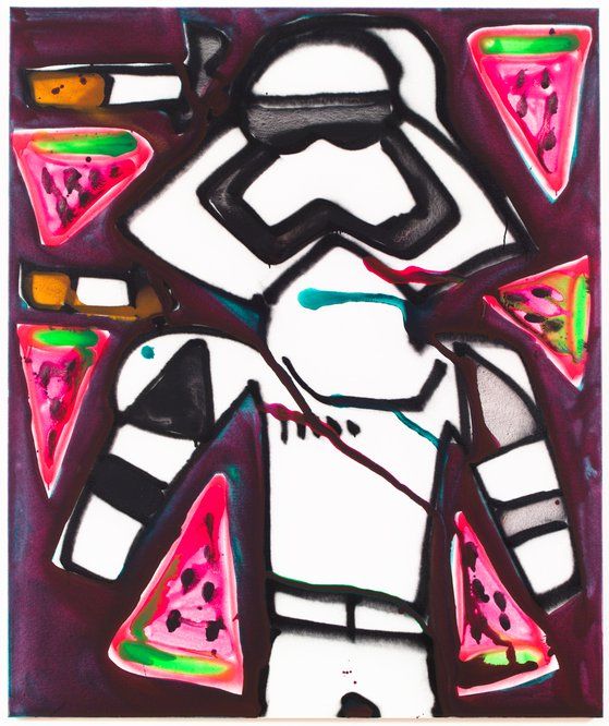 Green pushes the parameters of Bernhardt “pattern” paintings that debuted at CANADA three years ago. The paintings were wild mixtures of seemingly unrelated objects (plantain chips, airplanes, cigarettes) depicted radically out of scale in relation to one another and executed with non-hierarchical conviction. The most recent paintings feature a new collection of imagery: Oaxacan bird symbols, avocados, Agua de Jamaica, cross sections of watermelons, bottles of Coke and stormtroopers that add to her ever-expanding personal lexicon.