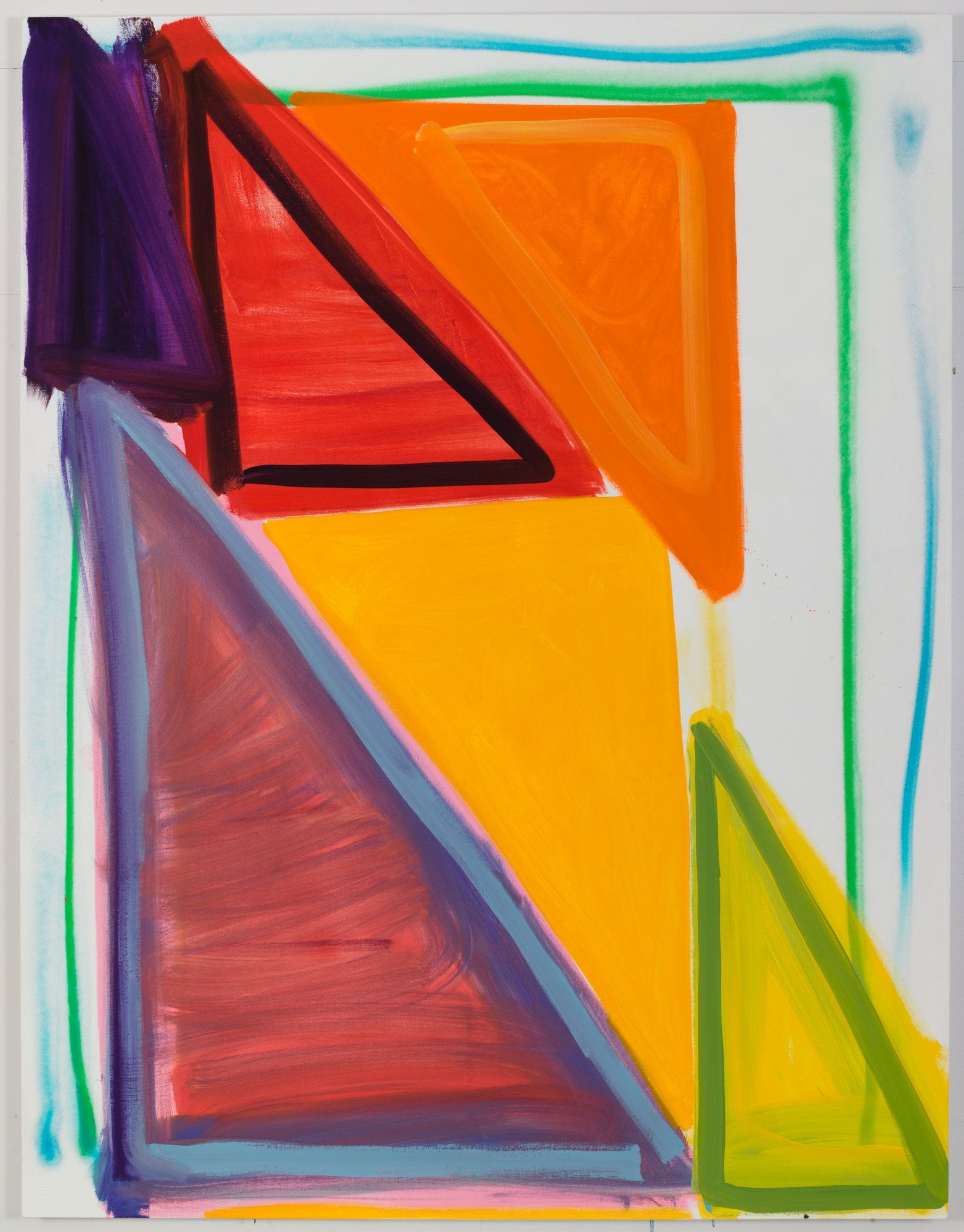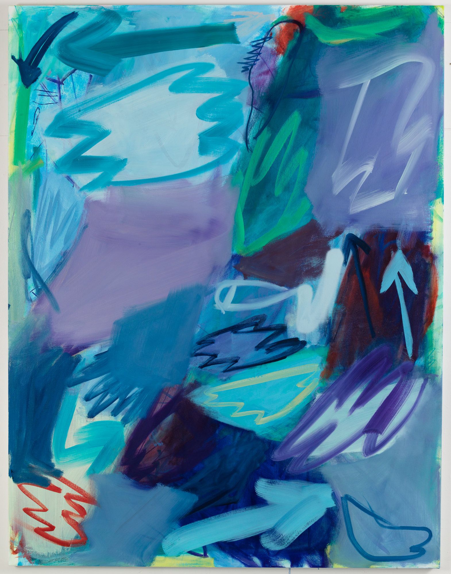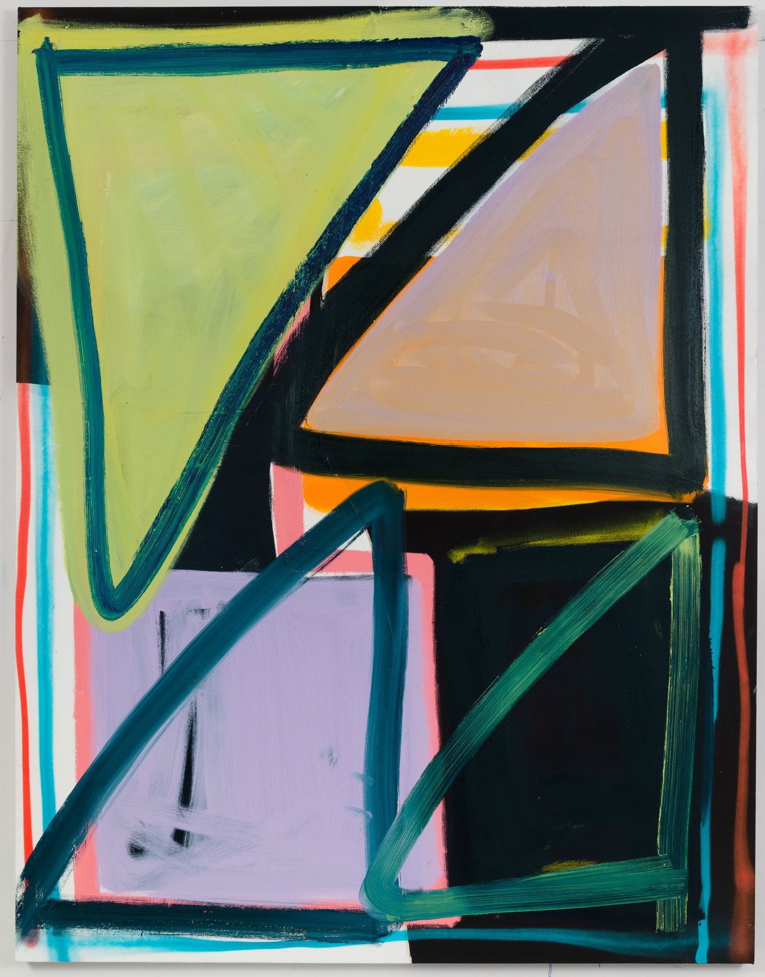 Laska’s paintings are full of suggestions, helpful or otherwise, guiding us where to look. The idea that a painting is series of directives for the viewer to follow is interrogated in Laska’s work. The gravity of the paintings is often undercut by a palette of bright primary colors applied in thin washes with occasional bursts of bravura spray paint or brushy scribbles. Strident confidence is often relaxed and reintegrated into something pillowy.