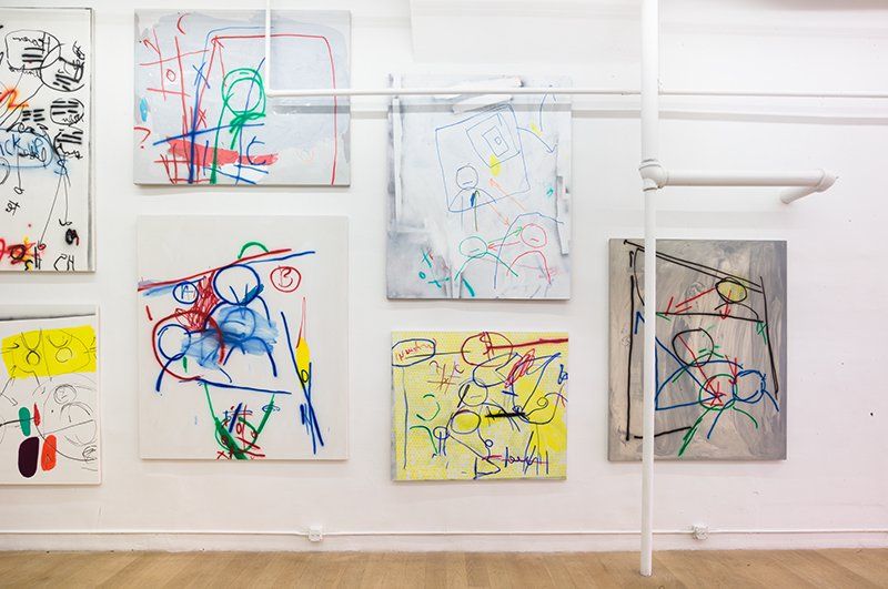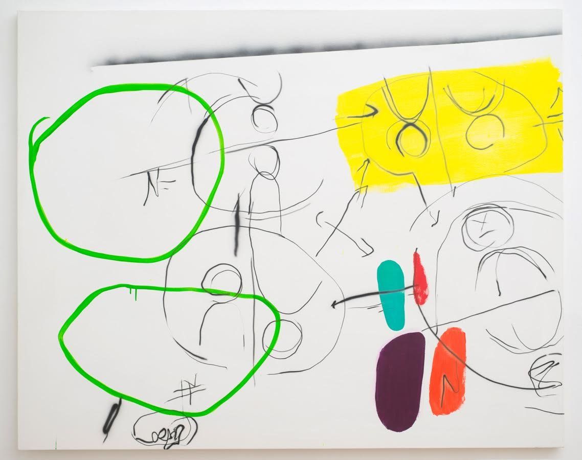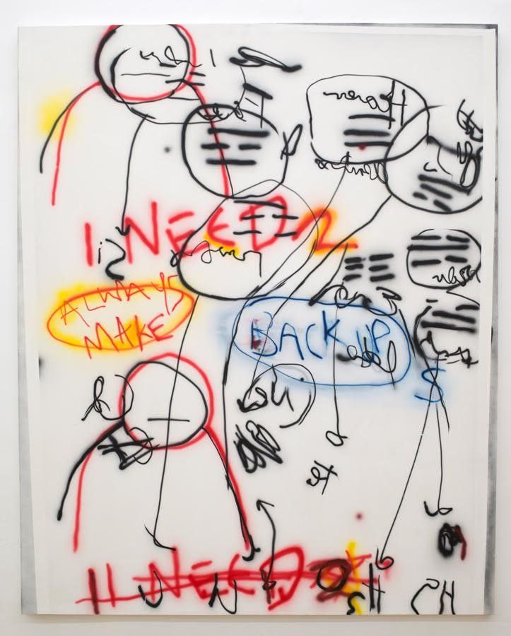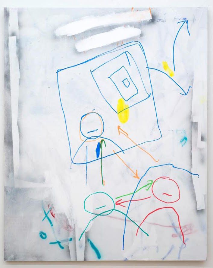 Murphy approaches his painting surfaces like an engineer with a white board. He draws diagrams as though working out a drawing problem. Hangman figures look, point, click, amidst arrows that suggest networks or systems. The painting space is energetic but unsettled, with almost indiscernible ‘Ah-Ha!’ moments buried under shorthand. They are redolent of programmer’s conference room sketches-- or so-called user-interface diagrams--a mode of communication native to Murphy’s former career in the tech world.